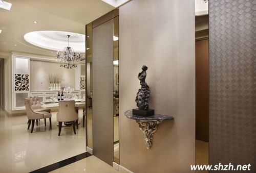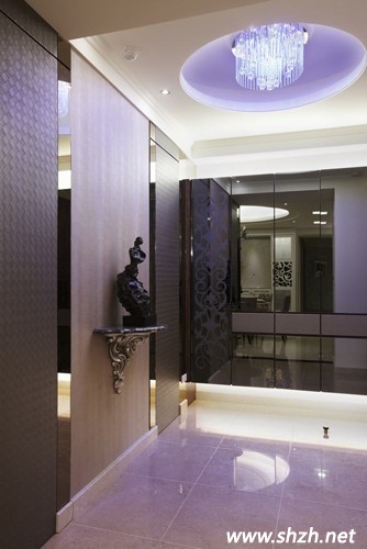 先看玄關(guān)的設(shè)計吧,設(shè)計師巧妙運用多種材質(zhì)的混搭。不同材質(zhì)的注入,有混搭木、石、皮革等,再配上柔和的紫色燈光,各種材質(zhì)打造的裝飾物都能成為玄關(guān)亮麗的一道風景。