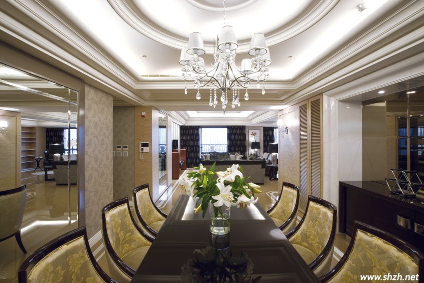 同樣與客廳相鄰的餐廚區(qū),沿著走出玄關(guān)左轉(zhuǎn)的主要?jiǎng)泳€,隨即進(jìn)入客、餐廳間的緩沖地帶。餐廳上方多層次的天花造型,融合圓、方以及復(fù)式線條間的幾何變化,輝映水晶燈飾,與氣質(zhì)優(yōu)雅的古典餐桌椅組合形成親昵的對話,兩端還有典雅的百頁餐柜設(shè)計(jì)提升生活便利性,特別是墻體中央導(dǎo)角拼接的茶鏡背景,為視覺帶來低調(diào)的鏡面開窗效果,空間感更為開闊。