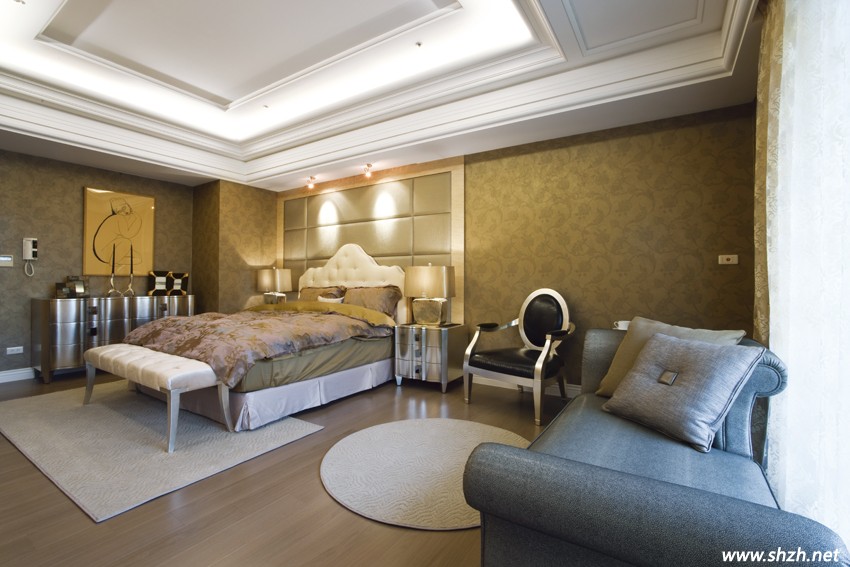 極度優(yōu)雅的主臥空間內(nèi)部機(jī)能動(dòng)線的分配十分從容,既富有風(fēng)情萬種的新古典魅力,也能嗅到現(xiàn)代風(fēng)格的人文內(nèi)涵。整體布局上總計(jì)劃分為沉穩(wěn)、奢華的睡眠區(qū)、床尾兩側(cè)分別為專屬衛(wèi)浴與精美更衣間,低調(diào)優(yōu)雅的壁紙圖騰與沉穩(wěn)的木色相互輝映,床頭造型則以柔軟的方格絲質(zhì)繃布工法烘托私密的浪漫情懷,床尾的視聽墻擁有多元的復(fù)合機(jī)能設(shè)計(jì),除了局部石材臺面擺放電視,上柜底部加裝嵌入式照明,細(xì)節(jié)處的經(jīng)營相對用心,表材木料與生俱來的細(xì)膩紋理,順著轉(zhuǎn)角弧形高柜一路延伸進(jìn)入更衣間,為空間注入更多自然氣息。