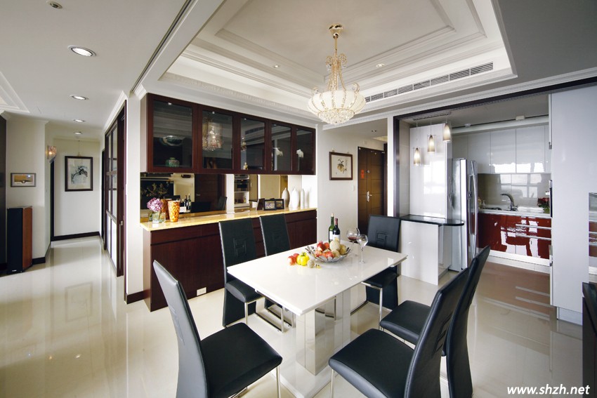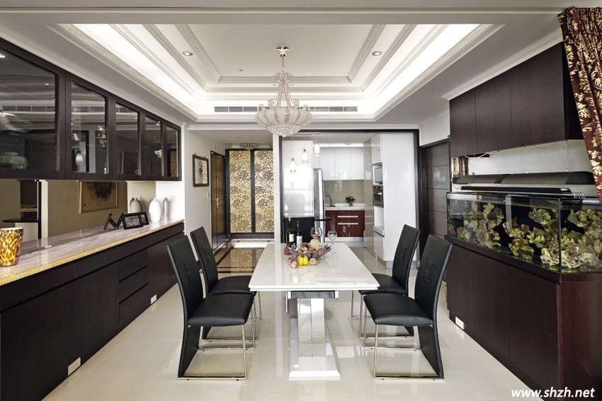 玄關(guān)與客廳之間為餐廳、廚房所在區(qū)域,洗煉的黑色皮革餐椅搭配光芒四射的水晶燈飾,餐桌兩側(cè)分別是氣勢不凡的餐柜與生機盎然的水族端景柜設(shè)計,透過線條的等比塊面分割,打造出長列延展的上、下餐柜,除了滿足公共空間充分的儲物需求外,柜體中段還搭配茶鏡襯底,加上黃玉石特制的透光臺面,煥發(fā)廳內(nèi)美輪美奐的繽紛光影。餐廳上方對應(yīng)餐桌椅的天花造型,漸進的落差有效提升高度感,透過層板燈光加強效果,精致的線條層次展現(xiàn)施作上的專業(yè)水平。一旁的半開放廚房隔著刻意加大的木框門拱、小巧吧臺與餐廳相鄰,除了一字形的料理工作區(qū),體貼的設(shè)計師還在廚房過道兩邊規(guī)劃便利的家電柜與食物柜,增加用餐時的生活情趣。