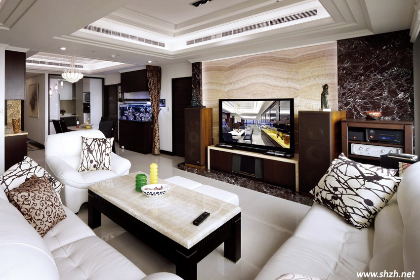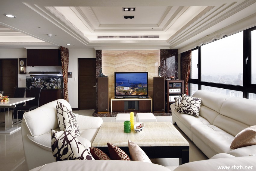 氣勢十足的公共空間為開放式規(guī)劃,客廳擺設(shè)著比例和諧、質(zhì)型俱佳的白色皮革訂制家具,視覺上不以制式的裝置元素切割平面,反而以更圓融純熟的手法營造連續(xù)面的整體美。氣勢恢弘的電視主墻中央同樣精選稀有的天然玉石精工打造,華麗而細膩的對花紋理,本身就是令人嘆為觀止的裝置藝術(shù),兩側(cè)搭配氣質(zhì)沉穩(wěn)的深金峰石材,運用色彩的深淺對比加強大面積量體的變化。避免繁復(fù)的裝飾線條喧賓奪主,僅在連續(xù)的落地大窗前方點綴局部藝術(shù)線板,帶出新古典特有的優(yōu)雅因子。