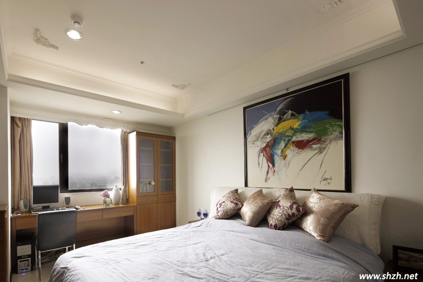家中的收納是整體規(guī)劃不可或缺的重要項目,全案裝修過程也因為櫥柜家具化的做法省下不少時間與金錢,基于事前精準的丈量,讓這些在工廠制作的系統(tǒng)櫥柜,可以在完成之后再運至現(xiàn)場搭配精致木作收邊來組裝,同時也因?qū)I(yè)工廠無塵的要求更高而倍增質(zhì)感,更重要的是大大降低施作現(xiàn)場的污染,可說是一舉數(shù)得,特別像是主臥室床側(cè)雅致的大型白色高柜,以及床頭后方附設(shè)更衣間內(nèi)并列的兩側(cè)衣柜和梳妝臺,都是優(yōu)質(zhì)系統(tǒng)櫥柜搭配部份木作的精彩示范。床頭格外精致的立面勾縫造型,經(jīng)由溫暖潤澤的實木紋理,烘托線條等比分割的簡潔造型,清新淡雅的色彩布局,大大提升私密空間的舒適度。