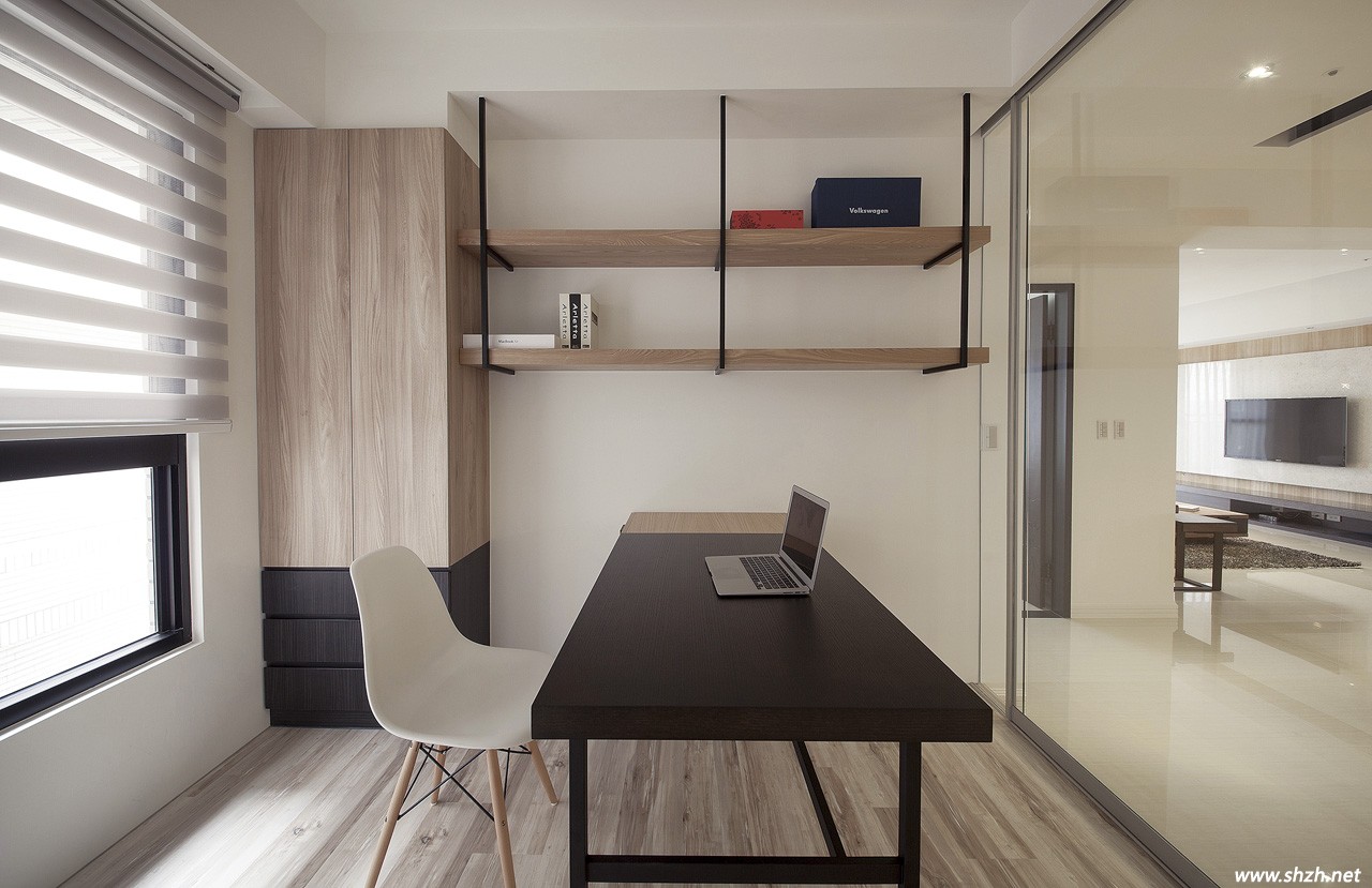 設(shè)計師還特地在餐廳旁構(gòu)置一處書房,鐵件與木作搭配出開放式的柜體,而且以善用空間的懸吊方式將其作為收納使用。日光乘著綠意穿透卷簾照耀入室,映照出光影層次,透明玻璃拉門更有一種視覺穿透的舒暢感。此外,未來家庭成員加上小孩時,這里也可做為娛樂室。