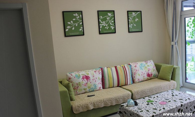 從陽臺(tái)開始來一一欣賞下主人的設(shè)計(jì)吧,玻璃玄關(guān)隔開的陽臺(tái),讓客廳顯得更亮,玻璃上的綠葉透著夏日的清晰。陽臺(tái)上鐵制的桌椅又帶點(diǎn)小資情調(diào)。再到客廳沙發(fā)選擇的是綠色的,連沙發(fā)墻上掛飾物也是綠色。主人大面積采用綠色才裝飾就是突然主題小清新。但是怕過于單一乏味,就在抱枕上采用顏色的搭配。