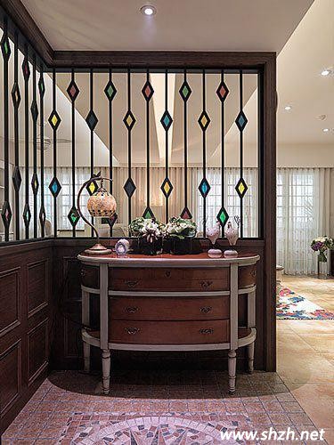 進門就用玄關將入戶處與客廳隔開,木質的玄關上鑲上上透明的玻璃,讓客廳采光效果更加,復古的木質桌椅,擺上歐式臺燈,看的出房屋主人對玄關處設計的用心,加上玻璃上五顏六色的菱形彩繪玻璃塊,讓室內(nèi)增添一股時尚。