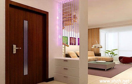 此圖的玄關裝修并沒有使用大面的玻璃然后加上一些彩繪點飾。而是采用單一的紫色彩繪玻璃連成串當作玄關。與客廳的簡約裝修風格一致。但是采用紫色室內(nèi)彌漫著永恒的愛的真情浪漫。