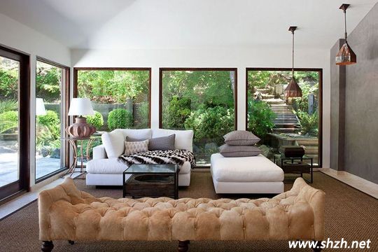 室內(nèi)的兩邊墻壁完全鑿開全部用作飄窗,簡(jiǎn)單的木質(zhì)鑲邊,沒有華麗窗簾的遮遮隱隱,將外面明媚陽(yáng)光,山水美色盡覽眼中,身處室內(nèi)如同置身大自然。室內(nèi)家具的裝修都是現(xiàn)代簡(jiǎn)約風(fēng)格渲染外面的自然美景,兩個(gè)古銅色的吊燈又給別墅增加了一絲復(fù)古韻味。