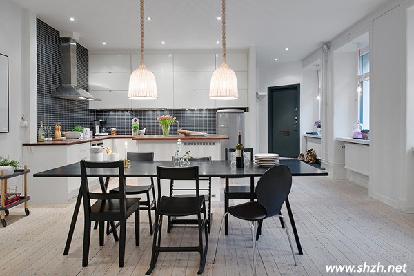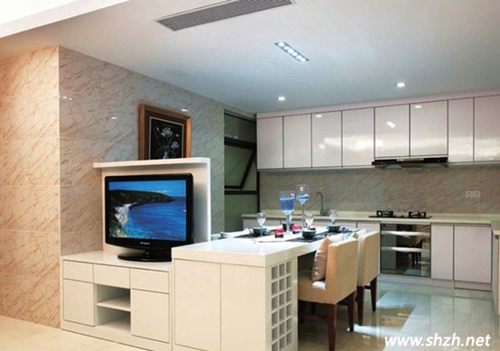 對于小戶型的我們廚房就如同這個案例一樣,不僅餐廚一體化,連電視前背景墻也依靠著餐廚空間。沒有用玻璃墻壁隔開,讓廚房,客廳空間無形中增大一倍。餐桌旁的墻壁上一副黑色底的掛畫,讓亮色系的餐廚增加點色彩感。處于密閉的餐廳空間吃飯,會讓人提不高食欲。