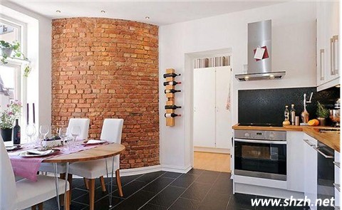 一眼吸引你的并不是廚房的裝修風格而是那紅磚砌成的四分之一的圓柱墻,加上旁邊創(chuàng)意的紅酒架,是不是有上個世紀80年代的復古感覺,黑色的地板與白色的吊頂形成經(jīng)典裝修風格,餐桌擺放在窗戶邊上,明媚的陽光能讓人吃飯時更加喜歡,窗戶上花花草草擺設讓廚房更有生氣。