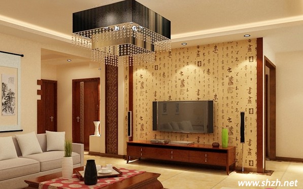 溫柔的光線穿過水晶掛珠造就房間如此溫馨祥和,掛在沙發(fā)墻上傳統(tǒng)的中國山水畫,電視背景墻上刻的秀麗的中國字,以及古樸的中式家具都營造地地道道的復古的韻味風格?;野咨暮竦咨嘲l(fā)給人安靜,頂上的方形水晶大吊燈讓室內更加和諧美觀。