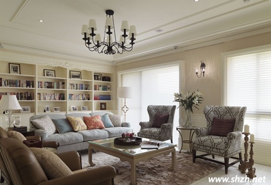 鐵制吊燈與深色皮革矮桌搭配淺色沙發(fā),對比色調(diào)讓空間表情豐富多元。而且還流露出一股歐式貴氣之風。