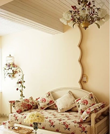 花瓣式的沙發(fā)背景透露了幾分甜蜜,給單調的白墻增添了不少分。用最小的投資打造最實用的效果。