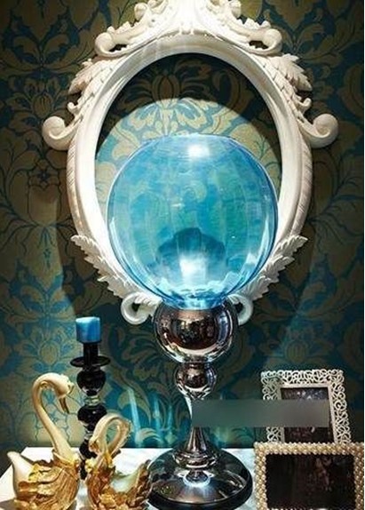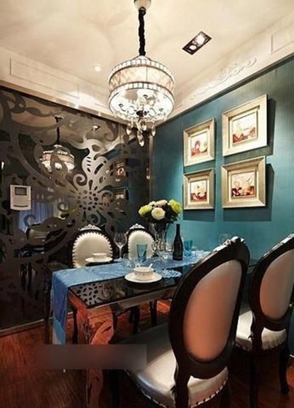 餐廳的吊燈是水晶的,這是不能錯(cuò)過的,整面墻是帶點(diǎn)藍(lán)色的。