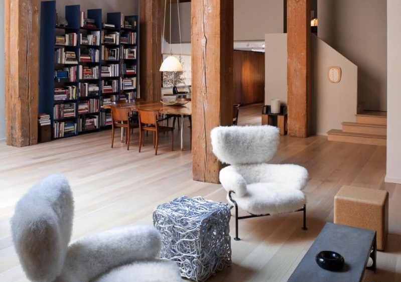 這個客廳的毛茸茸的椅子,冬日里的暖陽舒適度直線升高。像大海一樣的藍(lán)色書架讓原木色的居室變得深邃。