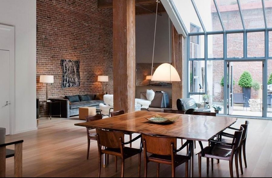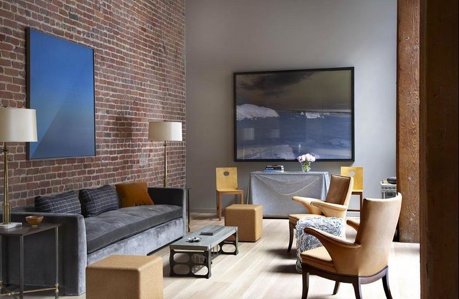 這個簡約自然的客廳,墻面背景墻從裝飾畫到布藝沙發(fā),再到燈具。沙發(fā)背景墻的大面積藍(lán)色裝飾畫與紅磚墻形成強烈對比。