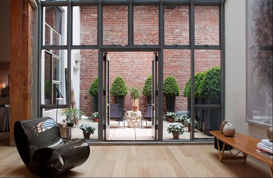 這個黑色的窗框把室外的景色分割成不規(guī)則的矩形,椅子造型時尚,與屋外的綠色盆栽相印成趣。
