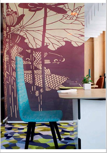 墻紙中式紋樣的放大,在視覺上極具沖擊力。 與幾何形圖案的地毯搭配,為享用大餐提供了現(xiàn)代又古樸的氛圍。