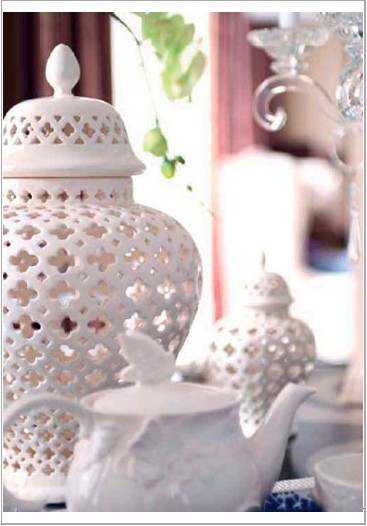 鏤空花工藝的香爐,擺放在客廳里。純白色給中國風(fēng)為中國風(fēng)平添了一份清新與雅致色彩。