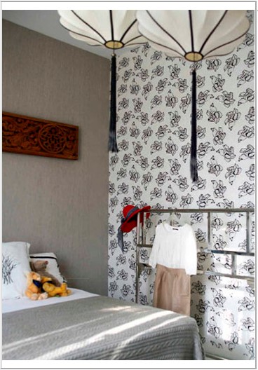 拖去老中的承重的步伐,我們以輕快、時(shí)尚的新中式來裝點(diǎn)屬于兩個(gè)人的世界。當(dāng)然即使是新中式,也不能一味堆砌中式元素。中式床榻經(jīng)過改良,線條流暢,時(shí)尚感十足,搭配色彩華麗的地毯,與墻上的裝飾畫相映成趣,大面積的灰色磚墻,中和了地毯的鮮艷,保持了空間的含蓄低調(diào)。