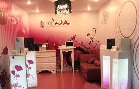 艷粉色的地板,紅色的沙發(fā),白色柜子,紫紅色花朵剪影及漸變色落地?zé)?,配搭上艷粉色的壁紙,處處充滿著誘惑的神秘感。充滿藝術(shù)感的圖案,帶有前衛(wèi)的時(shí)尚。