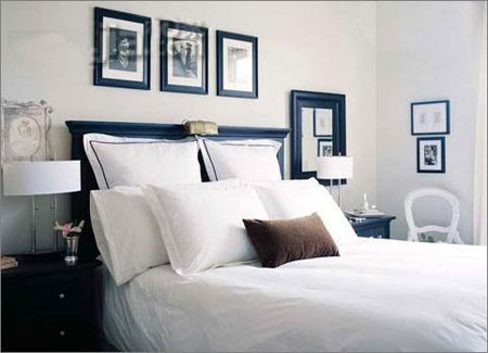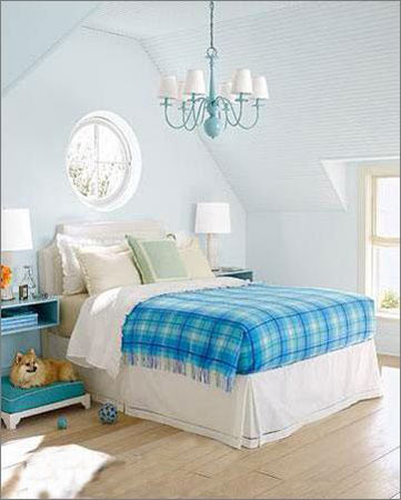 1.如果你的房間打算運(yùn)用中性的顏色,那怎么樣才能讓它變得出彩呢?很重要的一點就是要在房間中使用同種顏色的不同深度。在這個大部門留白的空間中,藍(lán)色格子的床品是視覺重點,而枝椏型吊燈、床頭柜、還有小狗的床都采用了藍(lán)色系列的不同深度。