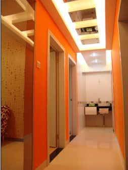 亮麗的橘色走廊的盡頭是一個公共洗手臺。