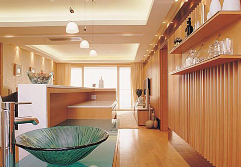 吧臺(tái)處設(shè)計(jì)了玻璃面盆,呼應(yīng)整體空間的時(shí)尚感。