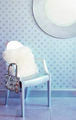 在灰色的墻面上畫(huà)上銀色的模板圖案,效果令人稱(chēng)奇。金屬光澤涂料容易顯現(xiàn)墻面的瑕疵,因此要事先做好表面預(yù)處理,選用100%亞克力涂料是不錯(cuò)的選擇,易于涂裝,干燥快。