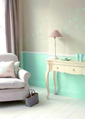 選用淺米色和藍(lán)色搭配在一起,給人寧?kù)o清涼之感,仿佛來(lái)自冰雕的國(guó)度。在鵝黃色的墻面上用冰藍(lán)色涂料畫(huà)上精美的枝條圖案,選擇亞麻沙發(fā)和米白色家具與之搭配。最為別致的是在木地板上,手繪出相似的簡(jiǎn)潔樹(shù)葉和枝條圖案。