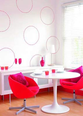 以亮白色為底色,在墻面上涂裝紅色的圓圈圖案,這種主題墻的效果引人注目。像是一匹放大的椅子包面,產(chǎn)生出奇妙的視覺(jué)幻象,適用于裝飾起居室,同時(shí)也適用于臥室。為了增加趣味性,嘗試用時(shí)髦獨(dú)特的紅色油漆裝點(diǎn)房間的踢腳板,標(biāo)新立異。