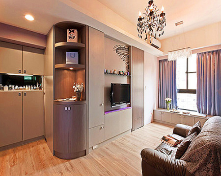 方案三:現(xiàn)代簡約風(fēng)格 家具的設(shè)定特別選擇較低水平線的小型家具,客廳墻面不設(shè)置電視柜,選擇小型視聽柜、茶幾,讓挑高的空間感覺更加放大。以架高地板的方式,設(shè)置小階梯,將臥鋪與客廳明確分別開來,并利用兩者地板間的落差,規(guī)劃抽屜式的收納柜,增加小空間里的收納功能。