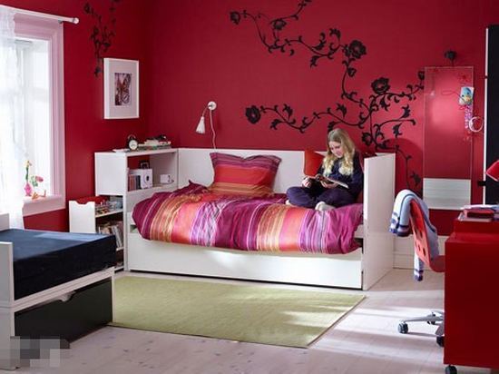 概要: 這同樣是一款浪漫公主臥室,白色與紅色的和諧搭配,讓空間甜而不膩。并且空間中整合了書房的作用,床頭柜很好地起到了書柜的作用。粉色的窗簾、粉色的床單,雖然顯得甜美,卻不似韓國風(fēng)格的那樣甜膩。因為家具選用了直線條設(shè)計,并且是木色與白色,壓住了粉色過度的甜美感。這是一款特別適合女孩子的嬌柔臥室。
