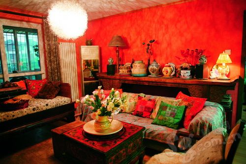 橘紅色的壁紙是裝修時最先定好的建材,于是其他的家具就不能使用反差太大的色彩,必須往暖色或者深色方面靠才能顯得協(xié)調(diào)。例如暗紅的藏式矮柜、深棕色的羅漢床、淺咖色的歐式椅都能較好地融入整體色調(diào)。而原本天藍色的沙發(fā)顯得有些偏冷,于是蓋上了有橘色花朵圖案的沙發(fā)布進行調(diào)和。