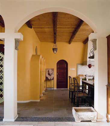 餐廳和廚房是開敞式的,拱形造型巧妙地把兩個(gè)空間相連,若即若離,拱形是歐式建筑中最常見的,圓潤的造型令人呼吸到田園的舒適和寧靜。而在餐廳與廚房的交界處,講究實(shí)用的主人特意定制了一套整體收納柜,將餐具酒器一一收納其中。