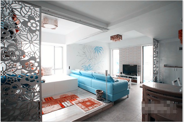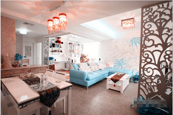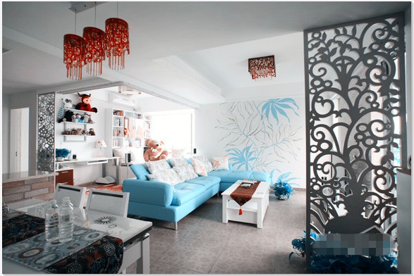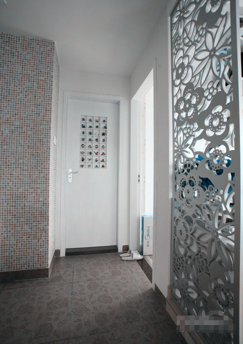 陽(yáng)臺(tái)過(guò)道簡(jiǎn)約鏤花隔斷,讓空間更富有層次感,時(shí)尚而精致。門(mén)面上的五彩小玩偶,時(shí)尚感的空間內(nèi)增添一絲樂(lè)趣。地面印滿玫瑰花的仿古地磚也別具一格。