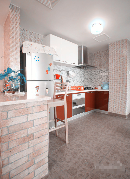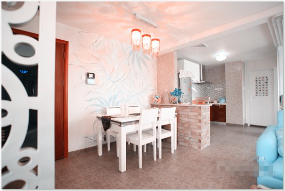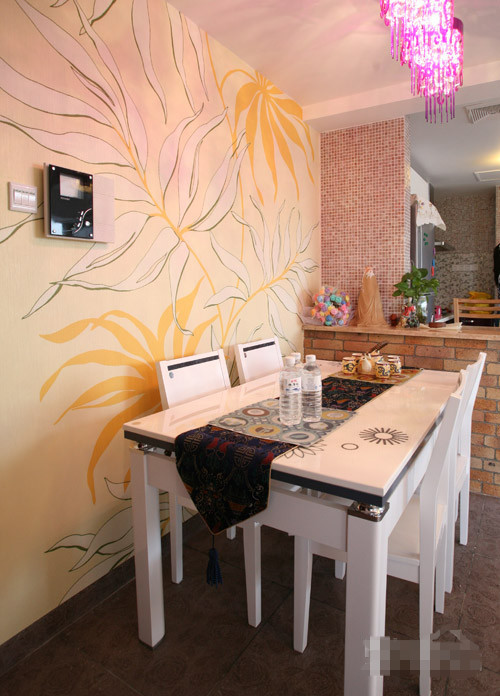 客廳一角,即被做成餐廳,墻面延伸了客廳背景墻的藤蔓花紋;略帶歐式風(fēng)格裝飾的四方桌為餐桌,用紅磚砌成的隔斷墻面將空間完美的分割開(kāi)來(lái)。