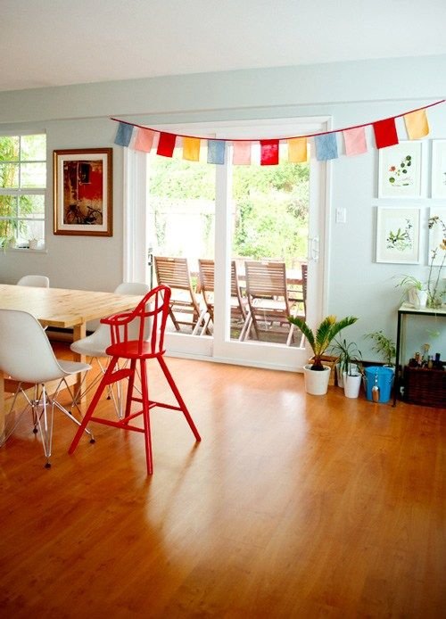 餐桌旁邊,紅色的嬰兒椅顯示寶貝家庭地位
