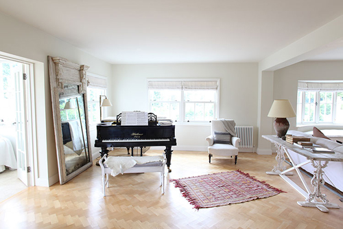 在沙發(fā)的后背不再是通常的背景墻,取而代之的是一架鋼琴和一面大鏡子,有著藝術(shù)的味道。這樣的無隔斷設(shè)計(jì)顯得整個(gè)空間大氣很多。