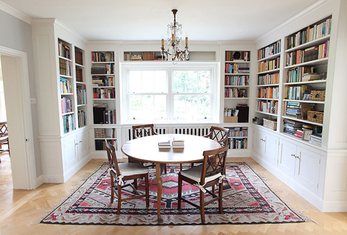這里可謂是閱覽室了,類似于餐桌的書桌圍繞著木椅,原木的座椅與色調(diào)鮮艷的地毯搭配,說不上什么風(fēng)格的搭配,看上去卻很舒適,完美。四周則是琳瑯滿目的書籍。