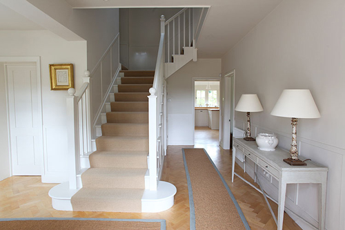進(jìn)入二樓的樓梯出,褐色夾雜著偏土黃色調(diào)的地毯隨著階梯緩緩而上。