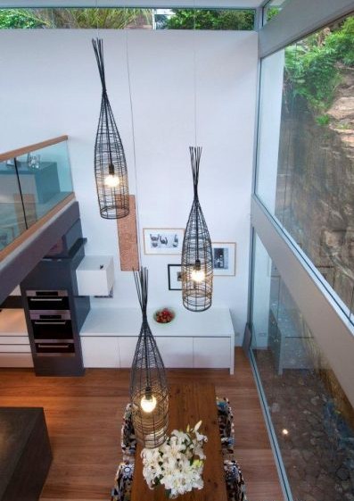 從樓上看這個(gè)餐廳燈具,燈具的造型都非常別致,使用黑色金屬作為燈罩,卻突出了天然的感覺(jué)又不失時(shí)尚元素。