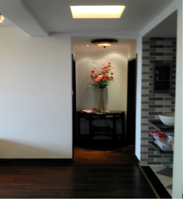 這是進(jìn)門區(qū)域的實(shí)景圖片右邊是客廳區(qū)域左邊是干濕分區(qū)的衛(wèi)生間區(qū)域進(jìn)門當(dāng)中是一個(gè)裝飾擺設(shè)架上面有裝飾,整體感覺(jué)空間一點(diǎn)都不單調(diào)!右邊的仿古文化石正體現(xiàn)出了古典風(fēng)格中以古典襯托風(fēng)格,天地方圓頂上的方形吊頂及米黃色燈帶都體現(xiàn)出了中國(guó)的古典文化及溫馨的感覺(jué)!