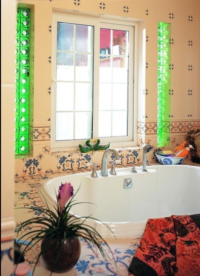 衛(wèi)生間里的色彩讓人感覺徜徉在花海里,浴缸周的花磚有沒有讓你感覺是在洗自然浴呢?