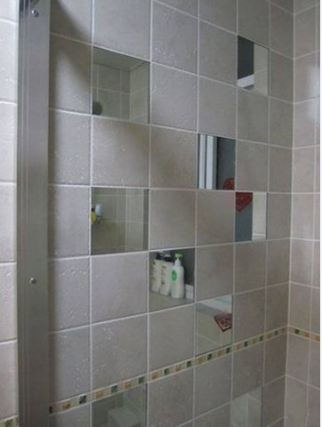 這是衛(wèi)生間淋浴房的一面墻,從墻面上摻插的鏡子墻面來(lái)看,收納儲(chǔ)物空間皆是有續(xù)的。