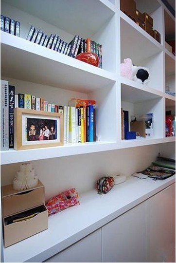 書(shū)房里做了一面書(shū)架墻,雖然這樣使本來(lái)就空間不大的書(shū)房更顯得小一些,不過(guò)這個(gè)收納空間非常實(shí)用,而且易清理,保存功能也很好。下排柜是一層柜門(mén)的,除了書(shū)本還可收納其它物品。