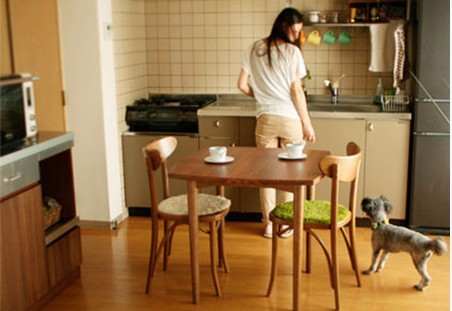 小餐廳與廚房是在一起的,水池與操作臺連著煤氣,加上冰箱的擺放位置正好是這個空間里的整體長度,一點(diǎn)空間都沒浪費(fèi)出來。廚房用具里的瓶瓶灌灌都有序的擺放在掛勾上。操作臺的下方是定制的廚柜,空間分明,可以根據(jù)要求,擺放不同的物品。餐桌的是精挑細(xì)選的哦,90公分長不到,兩個精致小巧的木質(zhì)餐椅。