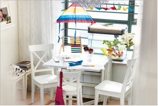 流線型設(shè)計的書桌椅,純凈自然。五顏六色的風(fēng)箏、紙鶴在綠色窗體的襯托下變得絢爛起來,為空間營造出小巧又亮麗的景致,整個空間都充滿北歐風(fēng)格的簡潔和自然美感。
