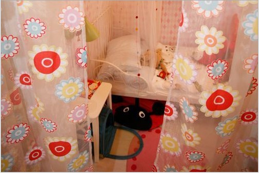 質(zhì)感如紗的艷麗隔斷簾,讓空間變的甜蜜而夢幻,圓形花朵的圖案別具一格,色調(diào)甜美的色彩給空間帶來絲絲溫暖、輕巧活潑。顏色和床品營造出既靈活又溫馨的睡眠環(huán)境。