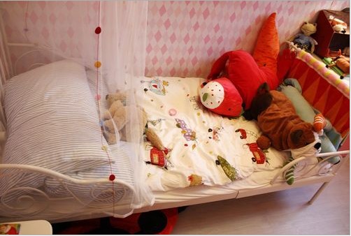 柔和的燈光,艷麗的色彩,都很好的緩和了鐵藝帶給人的冷漠感。床上凌亂的放著小朋友的玩偶,小小的它們可以成為家中的一個亮點,賦予空間更多的靈性與時尚感。
