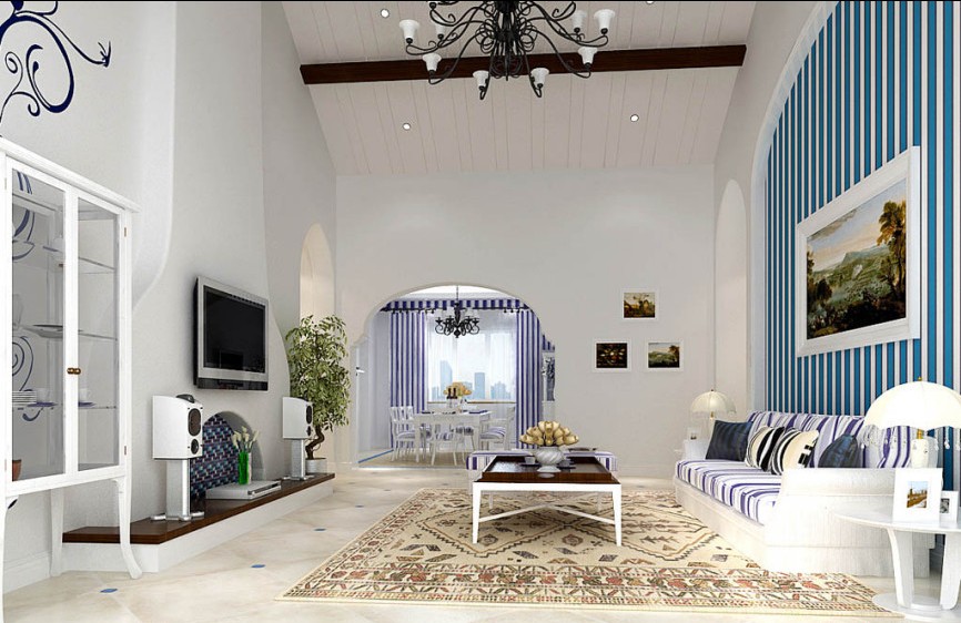 藍(lán)白條紋相間的家居用品在白泥灰墻的裝飾下變得純美。巨大的拱形門窗讓整個客廳顯得光線極好,藍(lán)白相間的色彩亦空間變得張力十足,無形中客廳在無限放大。